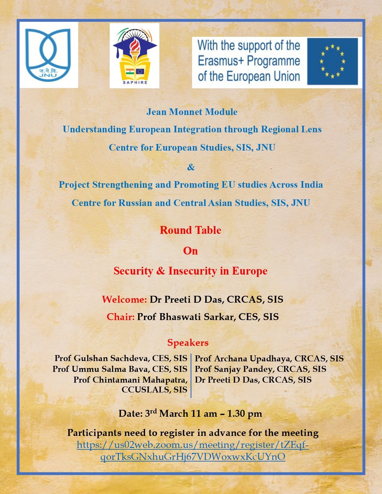 A roundtable talk on “Security and Insecurity in Europe”, was organized by the Jean Monnet Module Understanding European Integration Through the Regional Lens and the Centre for European Studies and Project Strengthening and Promoting EU Studies Across India and the Centre for Russian and Central Asian Studies, SIS, JNU in the School of International Studies, Jawaharlal Nehru University on 3rd March 2022.