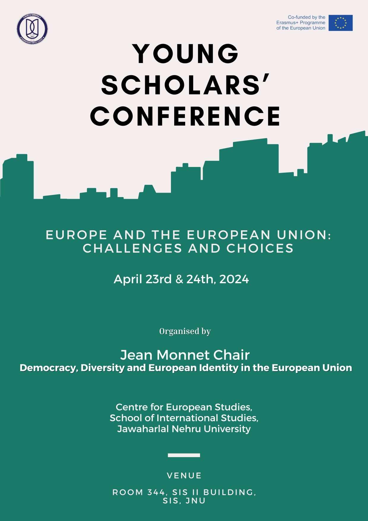 Given these developments, the Centre for European Studies is organising a two-day Young Scholars Conference on the theme “Europe and the European Union: Challenges and Choices” on 25 and 26 April 2024. The Conference aims to provide a platform for in-depth discussions by young researchers across India on the complex challenges and crucial choices facing Europe today. Through engaging presentations, insightful discussions, and thought-provoking exchanges, young researchers will have the opportunity to contribute their unique perspectives and explore potential solutions to the multifaceted issues shaping the continent’s future.